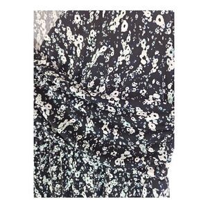 Stretch Polyester blend fabric with White and light green flowers on black background.