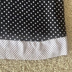 It has a crossover “V” neckline and flouncy sleeves. The hemline is a contrasting white with black polka dot chiffon. There is a side invisible zipper.