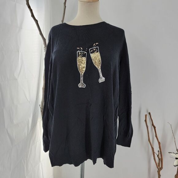 Black fun holiday sweater with clinking champagne flutes. Measurements are available when requested. Gently preloved condition. Any flaws will be noted.