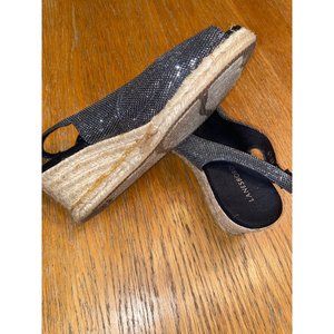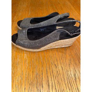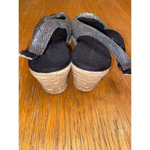 Features- 2.5" wedge sandals with soft bed insole, sparkly silver metallic with adjustable strap closure