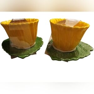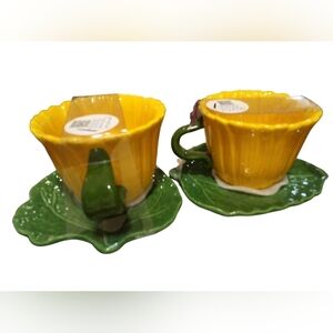 Lang- NWT, Yellow and Green Hand Painted Floral Mugs & Saucers.