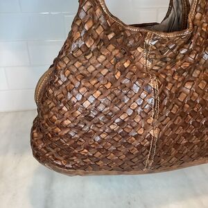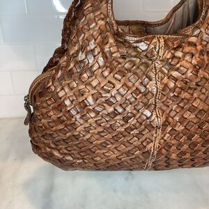 The LANGELLOTTI Brown Genuine Leather Woven Shoulder Bag is a stylish and versatile accessory. Made with high-quality Italian leather, this well-sized bag features a unique woven braided pattern on the exterior, showcasing a sophisticated and timeless design. The bag includes a zip, magnetic, and snap closure, along with double brown leather handles for easy carrying. Ideal for travel, casual outings, or workwear, this bag also features a lined interior with inner pockets for added functionality. Crafted with high-quality materials, it combines timeless elegance with everyday functionality. The intricate weaving pattern adds a unique texture, making it a versatile accessory for any occasion. Natural patina of the leather makes this bag look soft & supple. This bag is a real conversation piece. Photos are the best description of this Italian classic beauty. Please ask questions and make an offer!