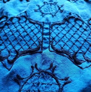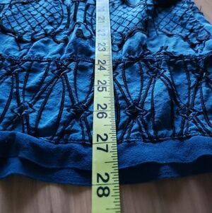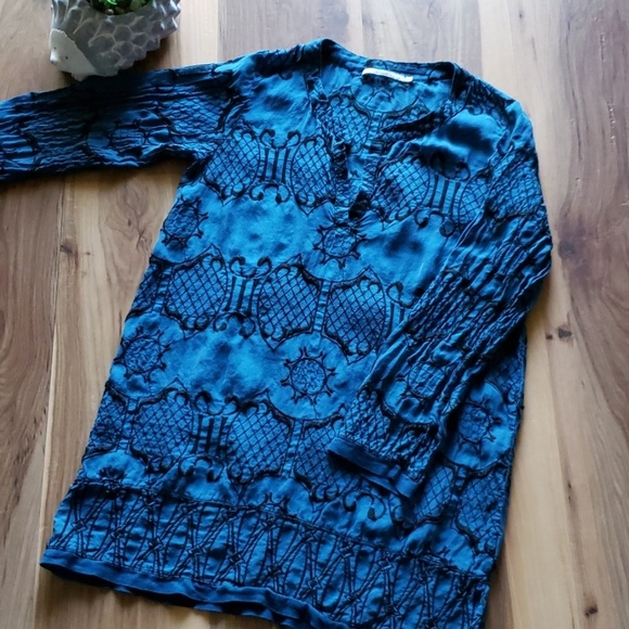 Language Silk Embroidered Top. Dark teal color silk with black embroidery.