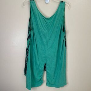 Green with black Aztec print, flowy, lightweight, back sits longer than front and super soft.