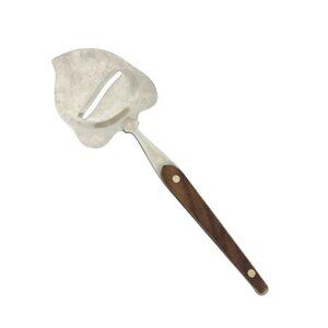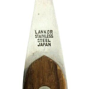 This vintage cheese slicer by Lankor, crafted in Japan, features a durable stainless steel blade and a riveted wooden handle, measuring 9.75 inches.