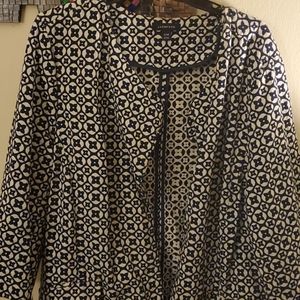 Navy and cream jacket with sleeves that fall a little below the elbows, nice with jeans, skirt, dress, plain sweater..100% cotton. Only worn twice.