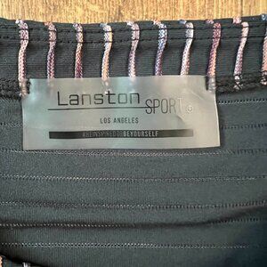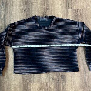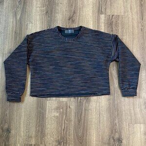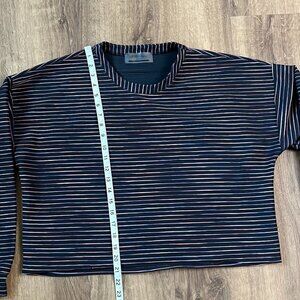 This is a really nice athleasure piece from Lanston Sport. It is a long sleeve performance sweatshirt top. It has raised stripes in variegated colors for a really nice texture. Long sleeve and ever so slightly gathered at the cuff. Thicker material. This is modernized with a slight cropped but in no way tummy revealing! crew neck.