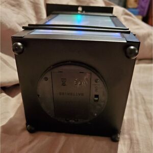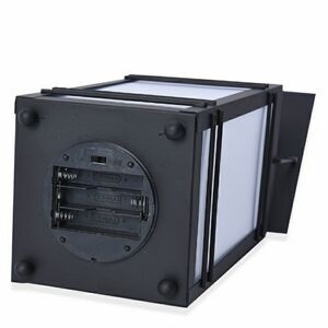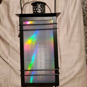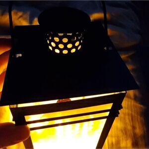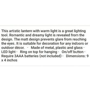 Black Hanging Standing Lantern. Mafe of metal, plastic and glasd. Ring on top for hanging. LED lights. On/off button. Requires 3 AAA batteries (not included)