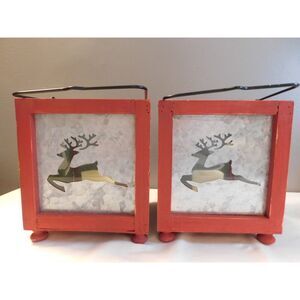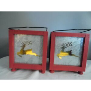 Red Wood Lanterns With Reindeer Etched Glass Insert with Fake Light Up Candles. Sold as a set of two. As you can see the candles work. Candles got hot in storage and are misshaped but they do work. Glass etchings in good condition. Measures 6 1/2" square. Please see pictures.