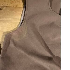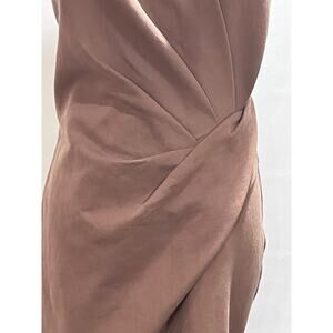 Very fitted stretch dress with gold tone zipper in the back and draped on the front without sleeves in biscuit color. Perfect with a neckline or with a boot that minimizes the look