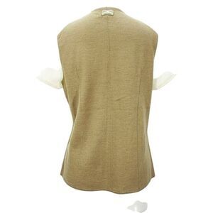 Authentic Lanvin short sleeve knit top featuring an elegant two-tone design—cream front and sleeves contrasted with a camel brown back. Made from high-quality wool blend, this sophisticated piece includes a front gold-tone zip closure adorned with a signature “L” zipper pull. Tailored for a flattering fit, it’s perfect for layering or wearing solo.