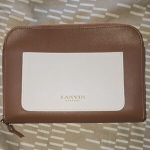 Chic Lanvin clutch in brown and white leather. Stylish and versatile accessory.