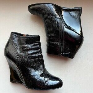 Lanvin Wedge Heeled Ankle Booties in Black Patent Leather, Women’s Size EU 39 US 8. These Italian, high quality boots are stylish & sexy. The patent leather is broken in & overall in good condition. Please consider bundling for the best deal. Thank you for shopping.