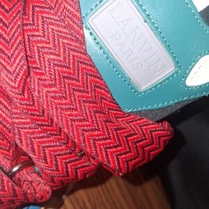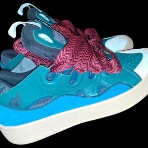 Vibrant Lanvin sneakers for women. Features striking red and teal design. Ideal for a stylish look.