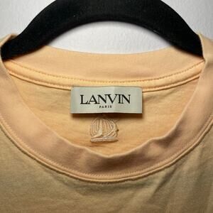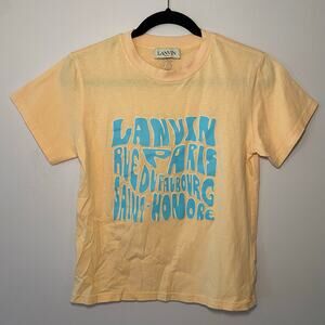 Lanvin Women's size Medium Peach Orange Bubble Letter Tee Slogan Print Paris. Lanvin Paris brand women's tee in a size medium. Peach orange colorway with blue printed letters. Short sleeve tee. Measurements as pictured. In great pre-owned condition, see photos for more details. Always feel free to ask any questions you may have! Reasonable offers accepted.