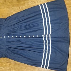 Elegant navy blue dress with a classic button-down front and white ribbon trim. Perfect for any occasion with 2 side pockets. Excellent condition. Any questions, please ask!