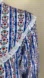 Floral print in red, blue, and green with blue and white vertical logo stripes.
