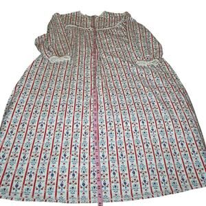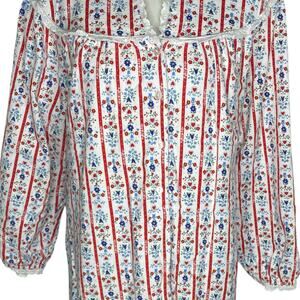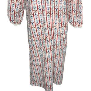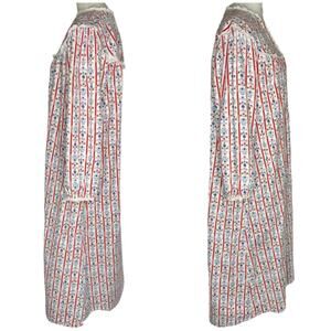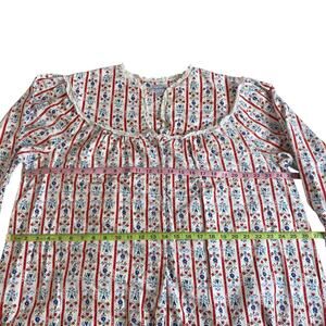 Features: pullover; flannel; eyelet trim at neck, yoke and sleeves; long sleeves with elastic cuffs; open neckline with 4-button front closure; long maxi length; stripe, floral, and heart motif. embroidered Lanz of Salzburg (LS) logo on inside back of robe; cozy; warm; sleepwear; cottagecore; grannycore; cabincore; lodge; retro; spring; fall; winter; Christmas gift; holiday gift