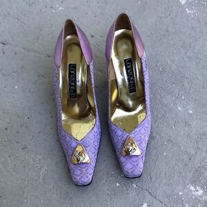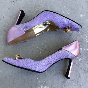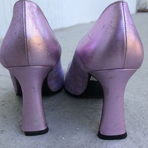 The color is lilac and they are fabric and leather with glitter. The buckle on the toes are perfect and stunning. Please look at the pictures, they need heel tabs and they have scuffs on the back of the heel that a good shoe man should be able to polish out and paint. These run narrow. Heel height is 3 inches