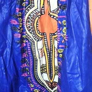 Vibrant multicolor top with intricate patterns. Features shades of blue, orange, and black. Stylish and unique design.