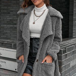Features: Long sleeve, drop shoulder, button front, pocket, shearling