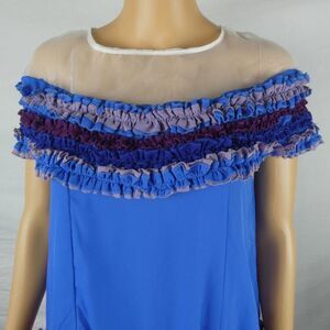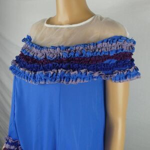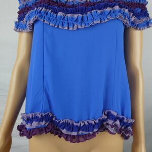 Beautiful and unique item, done in blues and purples with a sheer white panel top. Brand new with tag but has a tiny spot and almost hole, no size so see measurements.