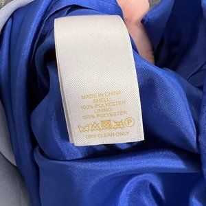 Bright Blue cotton faille (100% Polyester). Sleeveless. V-neckline. Full skirt with side pockets. Hidden back zipper with hook-and-eye closure. Full lined. 36” from shoulder to hem. Imported.