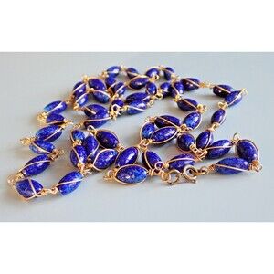Lapis Lazuli Bead Copper Wire Wrapped Chain Link Long Single Strand Necklace 48"
