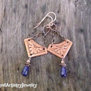 These One-Of-A-Kind "trapeze" earrings feature a pair of my hand-wrought scooped inverted triangle components embellished with Lapis Lazuli teardrop beads topped with solid copper beads. Rolo chain and twisted copper closed jump rings connect the components to my hand-forged earwires.