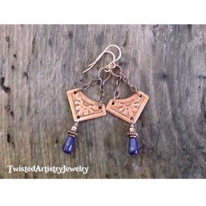 copper earrings, trapeze earrings, handmade earrings, unique earrings, lapis lazuli earrings, dangle earrings, hand-crafted jewelry, handmade jewelry