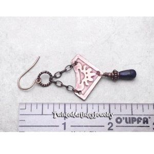 Dangle is approximately 2" long (approx. 2 5/8" long from top of ear wire). Findings and metal embellishments are solid copper; chain is zinc alloy (lead/nickel free).