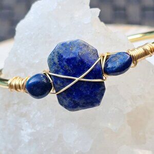 This handcrafted cuff features three radiant lapis lazuli stones—centered by a faceted gem wrapped in golden wire, flanked by polished companions