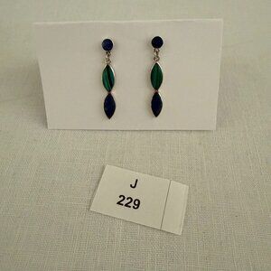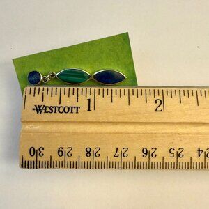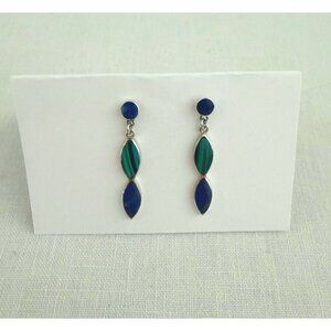 Elegant pierced drop earrings featuring alternating stones of rich blue lapis lazuli and deep green malachite, set in a silver-tone frame. Lightweight with secure post backs, these earrings offer a striking yet versatile look. Gently used with no flaws found. A bold piece for everyday wear or to add a pop of natural stone color to evening outfits.