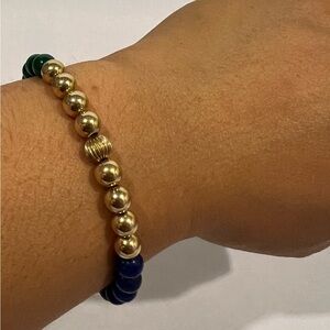 Stretch bracelet made of 6mm 14k gold filled beads, lapis lazuli and malachite gemstones. Strung on elastic fiber cord. Measures 6 3/4 but may fit up to 7”