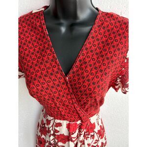 Lapis Red Floral Boho Faux Wrap Midi Dress Side Slit Leg Size S Feminine Modest