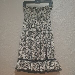 Elegant dress with a floral design. Features a strapless style. Ideal for stylish occasions.
