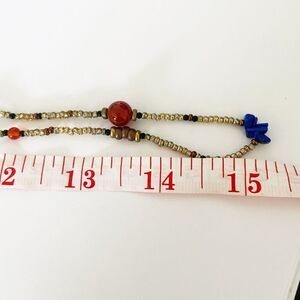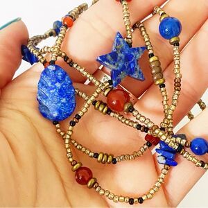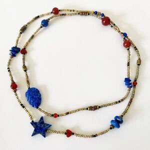 Lapis and Carnelian carved stone seed bead necklace 30”. Carved lapis star and leave design beads. Round and heart shaped carved carnelian beads. Long 30” strand. Excellent condition