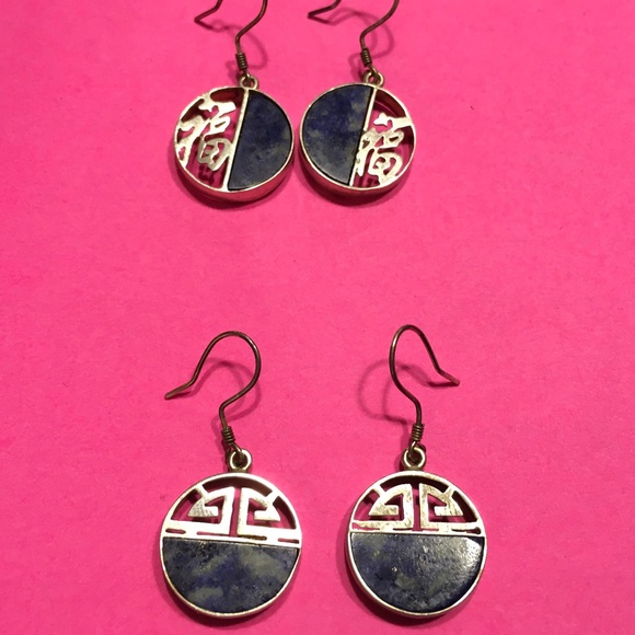 Lapis and Silver Chinese Character Earings. One pair is shou, longevity. One pair is Fu for luck. Ideal gift! Great for daily wear and holidays. Super as an anniversary present, hostess gift, or adoptive mom. Specify which style when ordering.