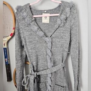 Lapis button down grey sweater size large wool tie waist penny lane Duster lapis