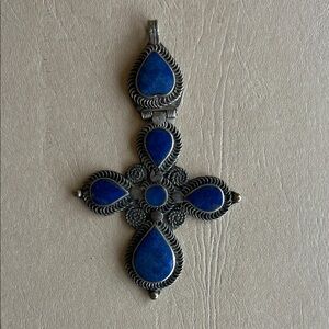 This cross pendant features lapis lazuli blue stone set in a beautiful silver design. No markings on back but beautiful craftsmanship.