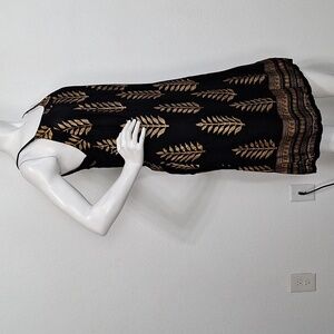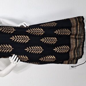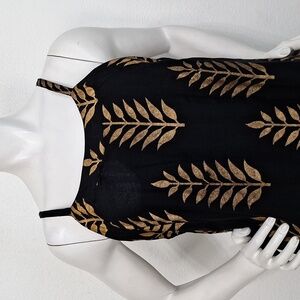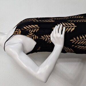 Lapogee Black Gold Feather Print Whimsigoth Bohemian Sheath Midi Dress Size L