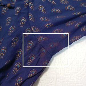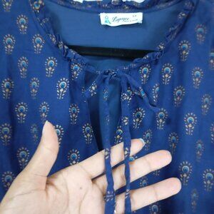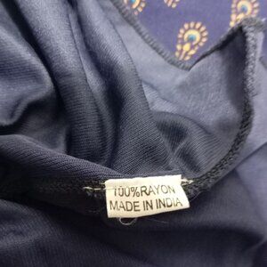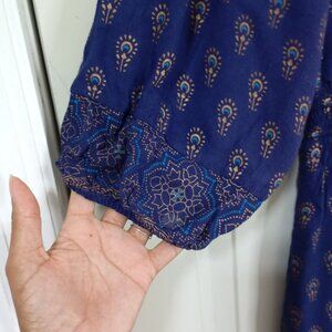 This midi dress offers a sophisticated bohemian touch with its intricate gold and teal patterns on a rich blue base, comfortable elastic waist, and tie neck.