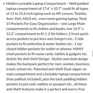 Plantero laptop backpack, black. This thing has more pockets and compartments than I could ever find a need for! A hidden laptop pocket, super-cushy shoulder straps, an attachment for your house/car keys, and you can use your wired earbuds/headphones without any wires hanging out cuz it's got a place for that as well. I love this thing, but it would never see it's full potential cuz I just don't have enough stuff, lol. This back deserves to be with someone that will use it as it was intended.
