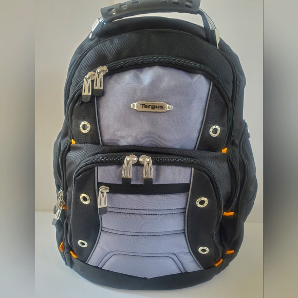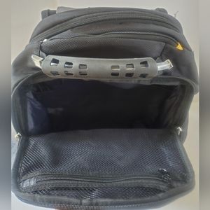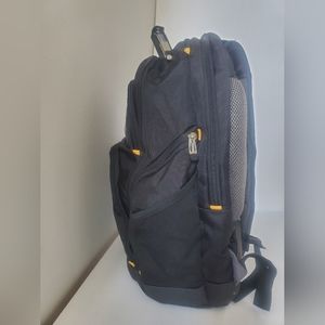 Black and gray laptop backpack with multiple compartments, padded straps and durable material.