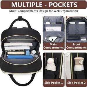 Large Capacity Backpack with Laptop Compartment - This big laptop backpack Total 4 compartments 22 pockets. The laptop compartment fit for 15.6 inch computer. The main compartment area holds A4 folders, work documents, clothes and other daily necessities. 3 front pockets for small items such as ipad, cell phones, Chargers, keys, pens, wallets etc. 2 sides pockets holds a 32oz water bottle and umbrella pretty well and more for a 3 day weekend.