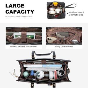 Large Capacity The measure of computer bags for women : 17.7*7.1 *13 inches. Independent padded laptop compartment, give laptop the best protection. The main compartment has ample space for books, ipad, portable power supplies, A4 documents, passports, umbrellas and more. 3 inner pockets and 1 zipper pocket for small items such as phone, wallet, makeup, passport etc.