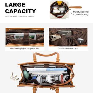 Large Capacity The measure of computer bags for women : 16.2*7.1 *11.5 inches. Independent padded laptop compartment, give laptop the best protection. The main compartment has ample space for books, ipad, portable power supplies, A4 documents, passports, umbrellas and more. 3 inner pockets and 1 zipper pocket for small items such as phone, wallet, makeup, passport etc.