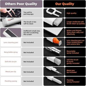 🧿DEEP CLEAN YOUR DEVICE The electronics cleaner kit can effectively deep clean all your electronic devices such as mobile phones, tablets, TVs, etc. It comes with retractable large keyboard brush, polishing cleaning cloth X 2, keycap puller, metal pen tip, flocking sponge, thin soft brush, soft plastic lens cleaning pen, 5 replacing cloth , large cleaning microfiber cloth. It's compact so you can keep one in a drawer, one in the car or in your bag