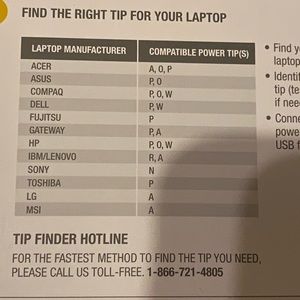 Targus laptop charging cable with 6 different connectors to fit various laptop brands. Can charge laptop and phone or tablet at the same time. In original box.