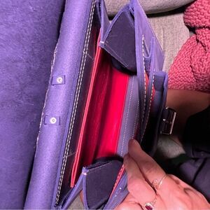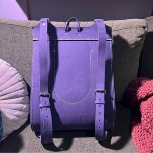 Blue stiff material. Buckle flap detail. Adjustable straps. White stitching. Multiple pockets. Laptop sleeve.